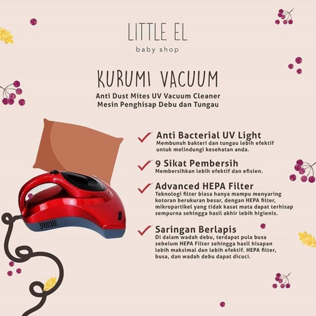 Sewa kurumi vacuum cleaner di gigelid kurumi anti dust mites uv vacuum cleaner adalah mesin penyedot debu dan tungau fitur produkanti bacterial uv light yang dapat mematikan tungau dalam sekejap9 sikat pembersih untuk membersihkan dengan lebih efektif dan efisienadvanced hepa filter yang mampu menyedot mikropartikel tidak kasat mata yang tidak dapat dibersihkan oleh vacuum biasasaringan. Detail produk kurumi uv vacuum cleaner red kurumi uv vacuum cleaner red merupakan mesin penghisap debu dan tungau berbahan berkualitas yang didesain ergonomis yang dapat digunakan untuk membersihkan ranjang karpetalas bantalguling. Gratis ongkir sameday delivery kualitas terjamin.